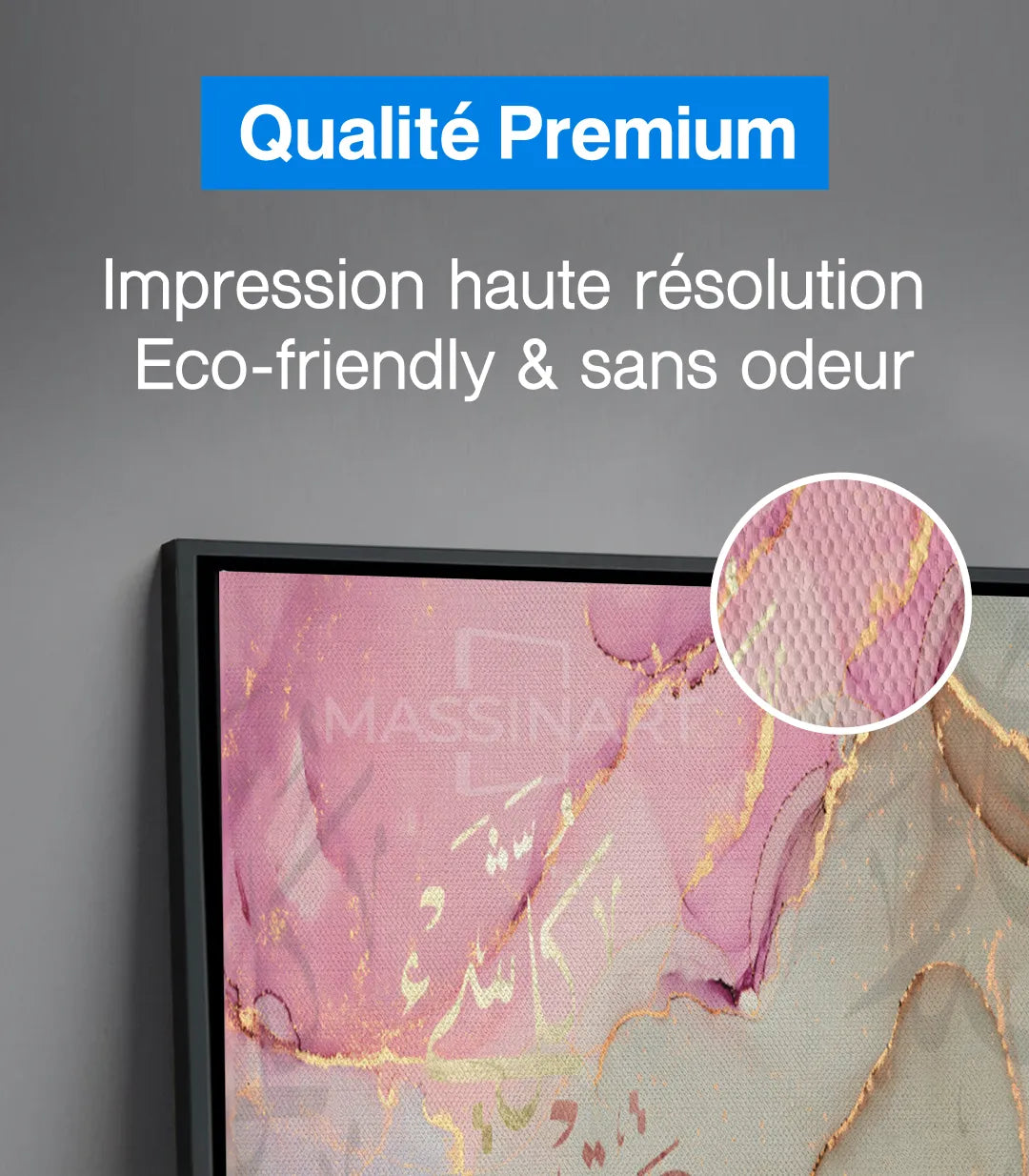 Découvrez nos tableaux exclusifs sur massinart.ma, alliant artisanat et modernité pour sublimer vos espaces. Chaque tableau est conçu à partir d’un châssis de 3 cm et d’une toile canvas artistique en coton (80 %), fabriquée en Allemagne. L’impression est réalisée en haute résolution avec des encres écologiques et sans odeur, garantissant une qualité exceptionnelle.